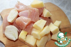 Для фарша: куриную грудку, очищенное яблоко, чеснок, соль и перец пробить в блендере