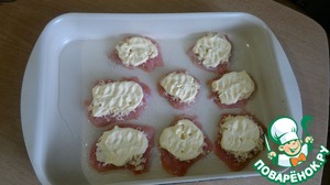 Выложить сырную стружку сверху на каждый кусочек, немного примять ложкой.