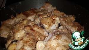 • Кролика помыть, убрать лишний жир (если таковой имеется), разделать на порционные кусочки. Посолить, поперчить, обвалять в муке.