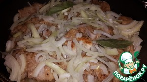 Когда кролик обжарится, сверху распределяем лук, специи, заливаем вином, накрываем крышкой и тушим примерно 30 минут.