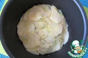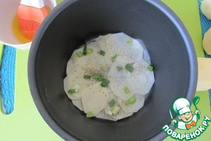 На дно укладываем слой ломтиков картошки внахлёст, смазываем маслом, присыпаем солью, перцем и щепоткой зеленого лука.