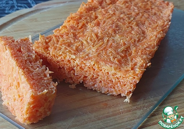 Даём остыть, вытаскиваем - и подаём! По консистенции блюдо получается очень нежным, сочным, ломким, пористым и влажным, нечто среднее между овощными оладьями и омлетом. Очень свежий морковный вкус.