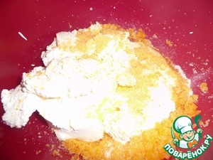 Муку порубить с маслом. Добавить сахар и ванильный сахар. Превратить в мелкую крошку.