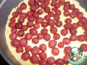 Вишню выложить на сито, дать стечь соку. Выложить на тесто.