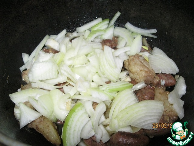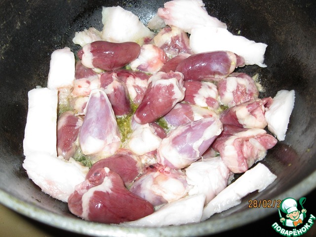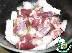 Отправляем в казан сердца и сало, нарезанное брусочками. Тушим под крышкой в небольшом количестве подсолнечного масла, доливаем, по мере испарения влаги, воду.