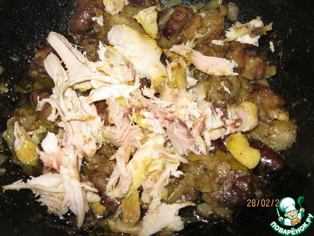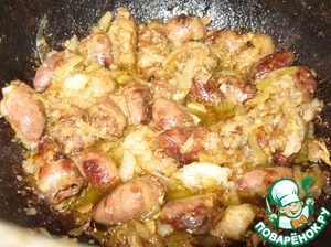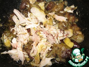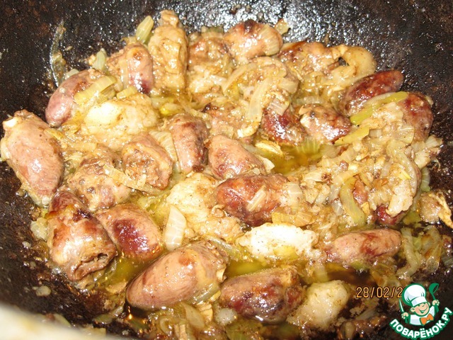 У меня был отварной окорочок, добавляем его мякоть к сердечкам