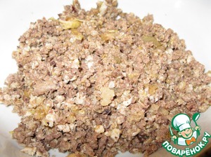 Перемалываем мясные продукты на мясорубке, разводим 70 г кипяченой воды - ее мы будем размазывать по блинам, поэтому она должна быть немного вязкой