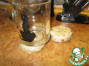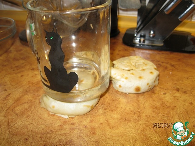 Выкладываем на столешницу, ставим сверху чашку из толстого стекла. За то время, что мы испечем, начиним и скрутим следующий блинчик, предыдущая улиточка остынет и зафиксирует форму
