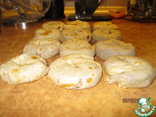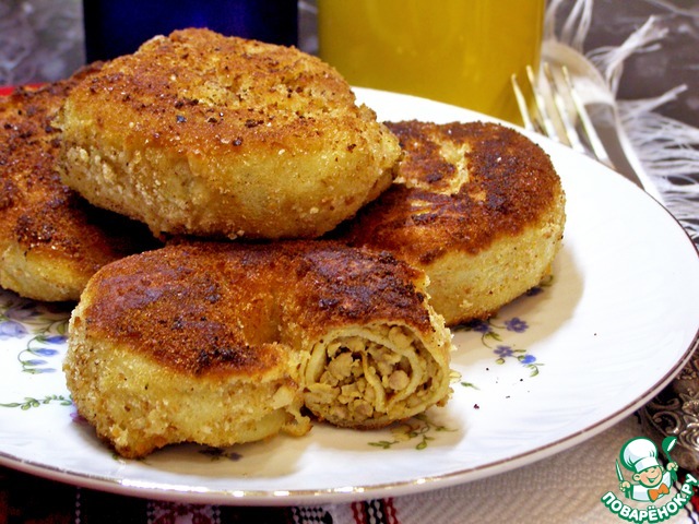 "Вдохнула жизнь в рецепт из книжечки без картинок 1970 г. НУ, ОЧЕНЬ ВКУСНЫЕ!!! Я только начинку изменила, в оригинале должно быть мясо, а я взяла куриные сердечки и окорочок. Этот рецепт для тех, кто хочет радовать простыми, но удивительными и необычными в исполнении блюдами. Если начинку приготовить заранее, то время потратим немного. Мясной вкус начинки "из детства", хрустящая корочка - оцените.