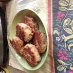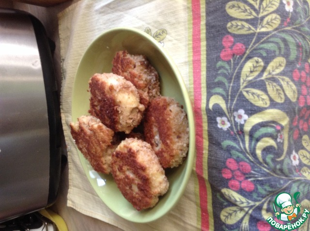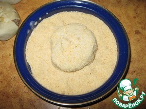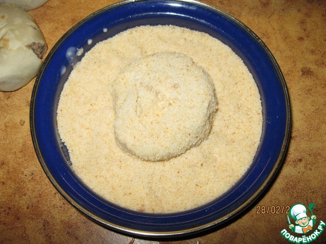 Получилось у нас 12 улиток. Не беда, если некоторые немного треснули, и виден фарш, мы это скроем панировкой. А панировка у нас - оставшееся блинное тесто (хватит 150 г) и панировочные сухари