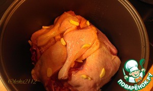 Вливаем воду до уровня птицы в чаше мультиварки. Отдельно в мисочке смешиваем мёд, сушёную паприку и соевый соус.