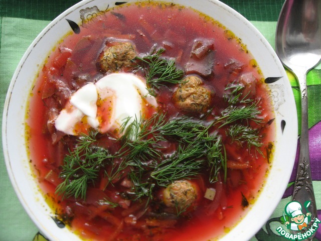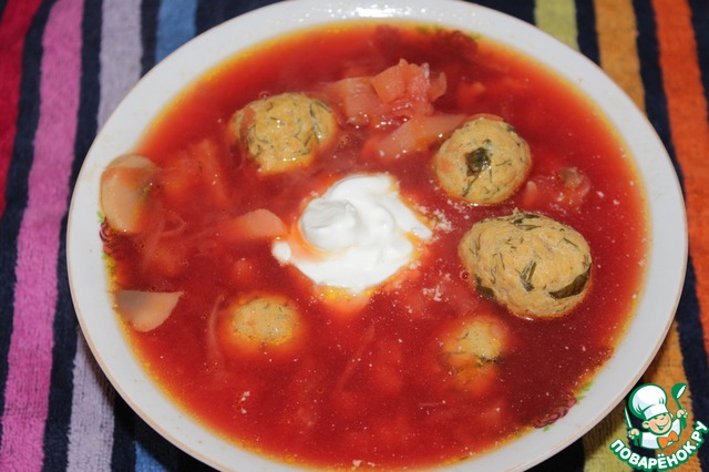 С фаршем поступила проще.По принципу приготовления клецек отдавливала его чайной ложкой об стенку миски и сразу в борщ.Из этого рецепта почерпнула для себя новое. Фрикадельки с сухарями и зеленью более нежные,чем полностью мясные.Сочетание кабачка,свеклы и грибов необычно,но вкусно.Точно знаю,что буду готовить не один раз.