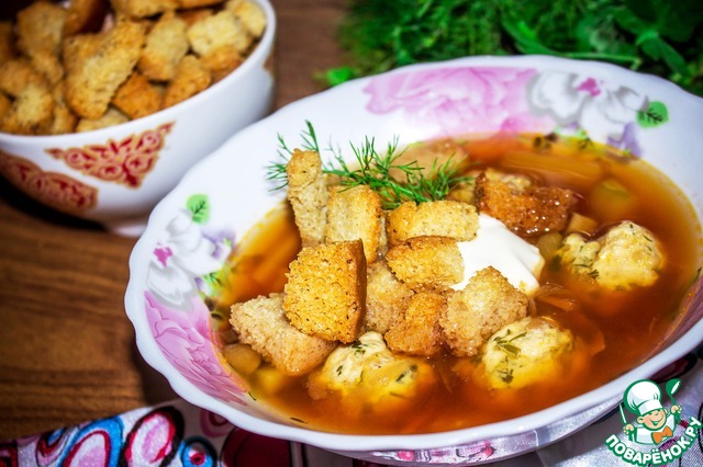 Рецепт от замечательного мастера кулинарии Оли Мартиросян из Питера. Правда, я внесла небольшие изменения, но это только потому, что обстоятельства заставили. Оля предлагала в своем рецепте отварить говядину на косточке в течение часа после закипания и на основе этого бульона варить суп. Но я готовила суп на даче, в полевых, так сказать, условиях, говядины с косточкой у меня в наличии не оказалось, зато был куриный бульон и немного фарша из куриной грудки. Их и пустила в дело. Суп получился невероятно вкусным, настолько вкусным, что сварила, съели, а уже через три дня семья попросила повторить рецепт "на бис".