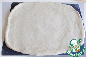 Тесто разделить на 2 части, хорошо вымесить, чтоб не осталось пузырей, раскатать 1 часть в прямоугольник 30*50 см