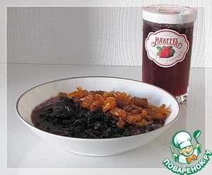 Изюм промыть и заранее залить кипятком. Размягченный изюм и цукаты порубить ножом и добавить в варенье. Я использовала клубничное варенье торговой марки "Махеев". Оно очень красивое, ароматное с кусочками целых ягод. Идеально в выпечке.
