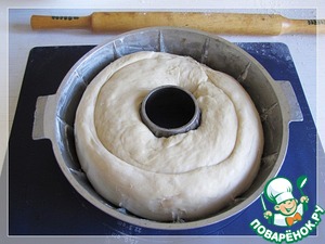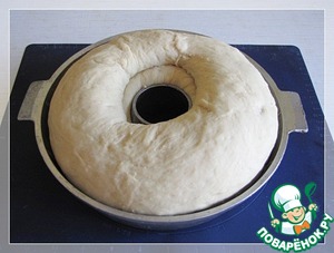Рулет свернуть и выложить в форму с дыркой посередине швом вверх. Края рулета постараться хорошо соединить между собой. У меня форма диаметром 22 см. Практика показала, что этого недостаточно. Нужно взять форму побольше, вставив в серединку жаропрочную емкость. Варенье утяжеляет тесто, и лучше, чтоб ему было больше пространства для подъема вширь.