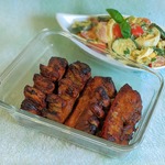 Грудинку режем на сегменты и выкладываем в маринад на 2 часа. Хорошо, каждый кусочек промазываем маринадом