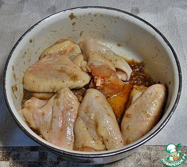Крылышки обмазать и оставить мариноваться при комнатной температуре 1-2 часа. В холодильнике можно до 1 суток.