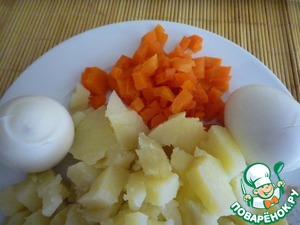 Картофель и морковь нарезать кубиком, а яйца просто почистить. -