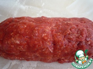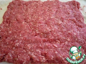 Выложить фарш в виде прямоугольника на бумагу для выпечки (это в первую очередь для удобства сворачивания рулета).