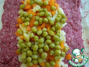 На середину прямоугольника выкладываем картофель, морковь и горошек.