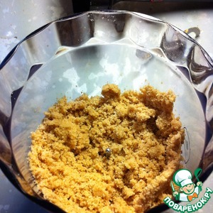 Поместить 300 гр. поломанного печенья в блендер и смолоть его в мелкую крошку. Добавить 100 гр. сливочного масла и перемалывать смесь до получения однородной массы. Если чаша блендера небольшая, следует печенье и масло перемалывать по частям.