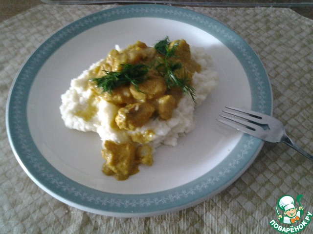 Куриное филе нарезать на кубики, добавить к луку, обжарить до румяности. Посолить, поперчить, добавить порошок карри.
