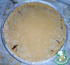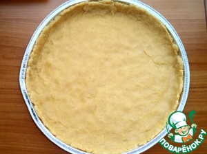 Выложить 2/3 теста в смазанную маслом форму для выпечки и пальцами распределить по форме, формируя бортики.