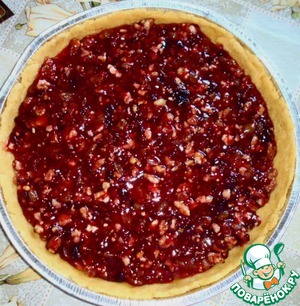 Для начинки смешать джем клюквенный и малиновый, добавить грецкие орехи, апельсиновую цедру. Выложить на тесто начинку.