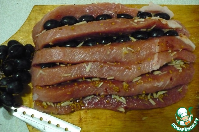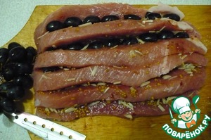 • Каждый разрез посолить, намазать аджикой, горчицей. Каждый разрез, вдоль, полностью заполнить половинками винограда без косточек.