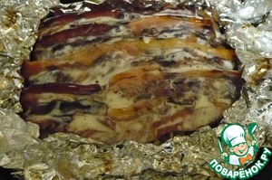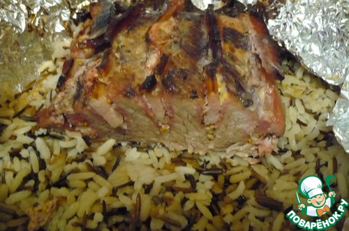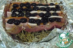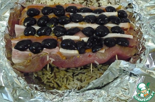 • После истечения времени отвариваем рис до полуготовности. Грудинку нарезаем тонкими полосками. Из разрезов убираем виноград и кладем грудинку. Закрепляем с боков при помощи зубочисток. Виноград укладываем с верху. Сковороду застелить новой фольгой и смазать маслом. На дно выкладываем рис. На него мясо. Хорошенько завернуть. На дно сковороды налить немного воды и запекать в духовке при t=180 в течении 60 минут.