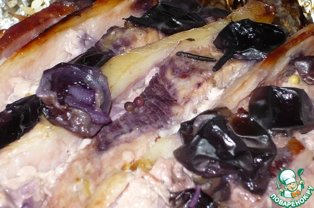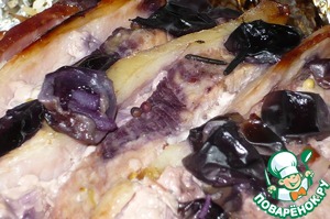 • Через час вынимаем, открываем мясо, но при этом не открывая рис. Убираем с верху виноград. Он свою миссию выполнил, отдал мясу все. Осталась только кожура.