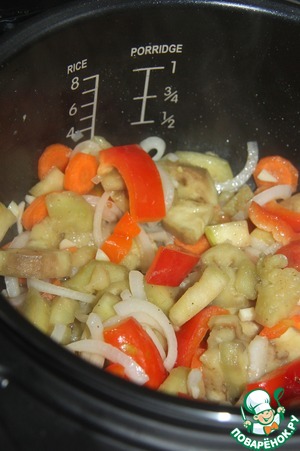Вынимаем нашу курочку из мультиварки, кладем вместо нее баклажаны и тушим еще 10 минут.