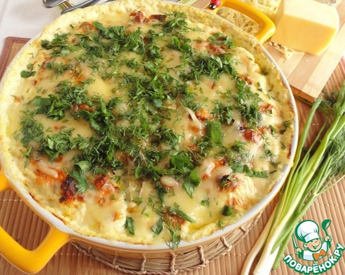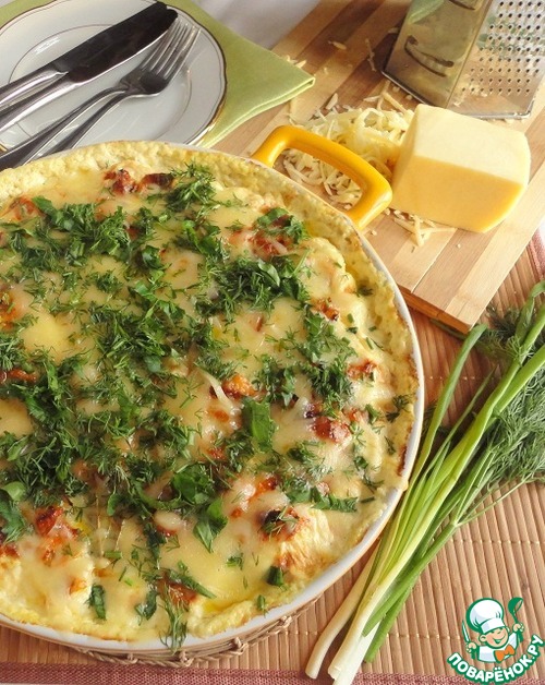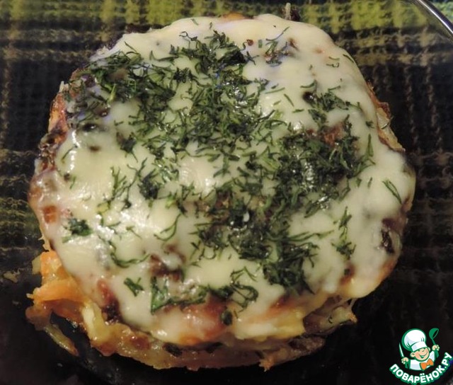 Достать из духовки, посыпать тёртым сыром и зеленью. Наш замечательный сытный ужин готов, встречайте гостей.