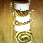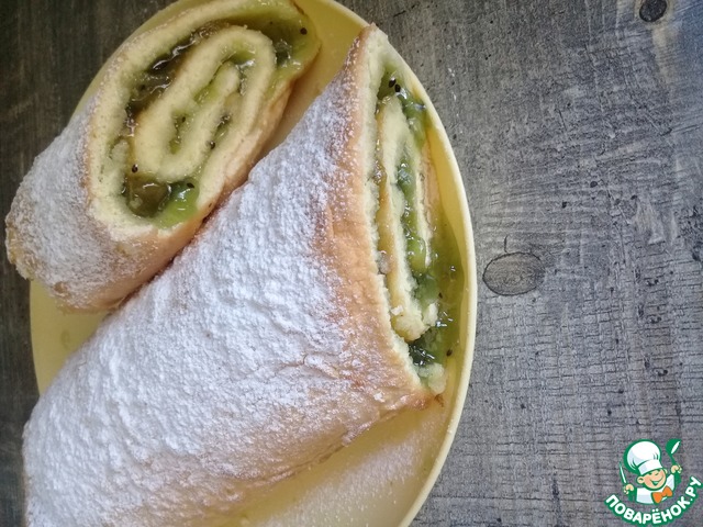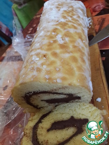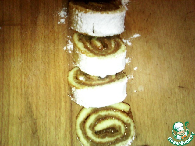 Снова свернуть в рулет и густо обсыпать сахарной пудрой.
