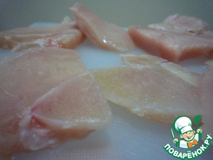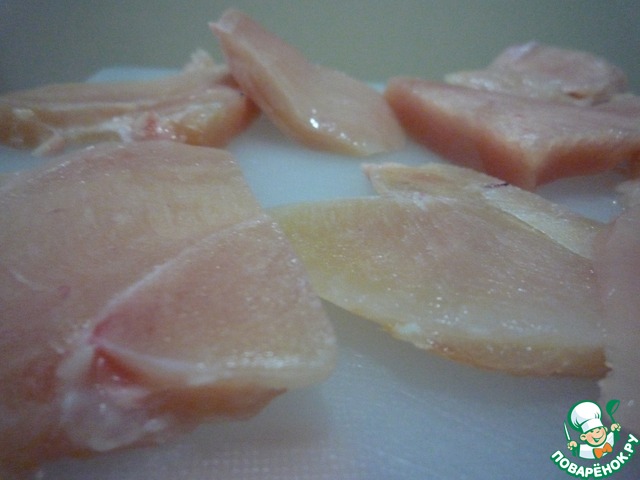 • Филе курицы разрезать на тонкие крупные куски. Слегка отбить.