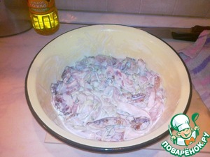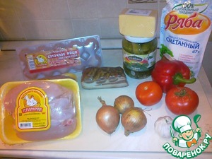 Соединяем продукты: маринованные огурчики, грудинку, куриное филе и заливаем смесью яйца с майонезом.