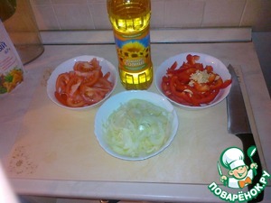 Помидоры, болгарский перец, лук репчатый и чеснок нарезаем соломкой.