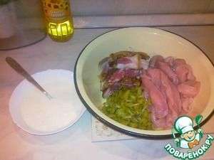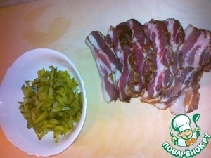Пока тушатся овощи, нарезаем соломкой маринованные огурчики. Грудинку режем тонкими пластинками.