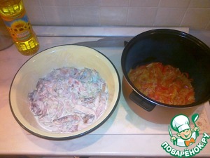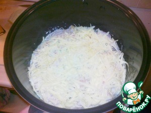 В чашу мультиварки выкладываем тушеные овощи, сверху закрываем нашей получившейся курино-огурцово-груд инково-майонезной смесью)