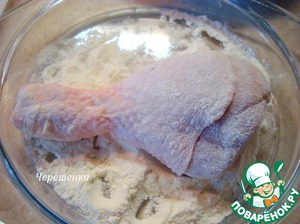 Теперь приступаем к панировке куриных ножек. Для этого сначала каждую голень обвалять в муке. -