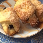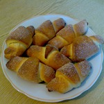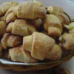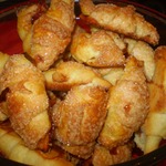 Берём по одному рогалику, верхней стороной окунаем в яйцо, затем в сахар. Выкладываем на противень, покрытый бумагой или ковриком, оставляя расстояние между рогаликами. Во время выпечки они сильно увеличиваются в размерах.