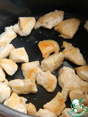 Филе куриное нарезать на кусочки. Обжарить на растительном масле.