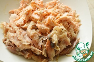 1. Семгу сбрызнуть маслом и запечь в разогретой до 180С духовке до готовности. Остудить. Рыбу отделить от костей. Филе скумбрии отделить от костей.