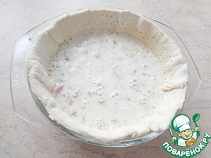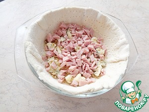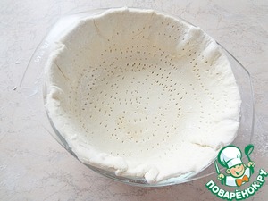 Раскатайте тесто на посыпанной мукой разделочной доске и расстелите его в форме для выпечки диаметром 17см, высотой 5см, обрезав углы. Если нужно, то форму смазать маслом. Наколите тесто вилкой. Поставте форму с тестом в холодильник - это предотвратит усадку теста при выпечке. С этой же целью форму с пирогом при выпечке ставят на горячий противень. Поставьте духовку на разогрев (200 С).