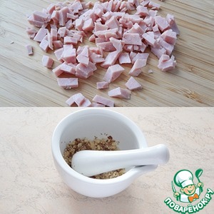 Раскрошите сыр по поверхности теста, посыпьте грецкими орехами и ветчиной.