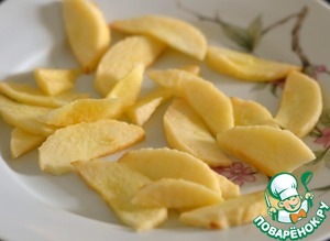 Яблоки очистить от кожуры и семян, нарезать тонко ломтиками. -