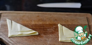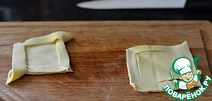 Тесто тонко раскатать - примерно 3 мм толщиной. Вырезать квадраты размером примерно 10 на 10 см.