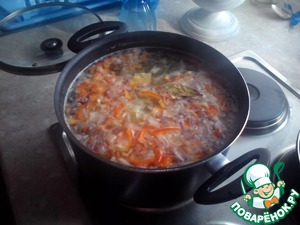 Добавляем в кастрюлю с картофелем и капустой болгарский перец, красный лук и чеснок.
