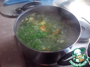 Добавляем в кастрюлю нашу пассеровку и свекольное пюре. Варим все это еще минут 10 и - наш борщ готов.